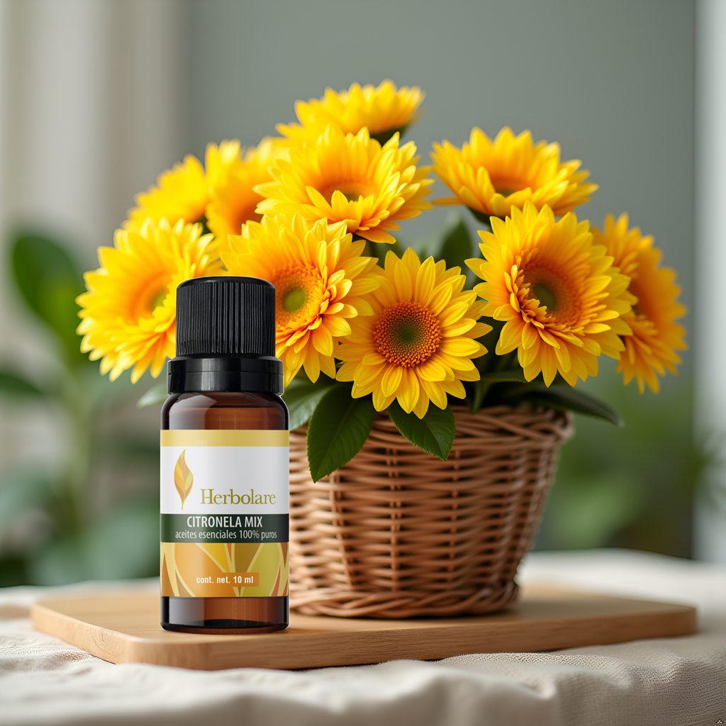 La mezcla Citronela Mix de Herbolare combina aceites esenciales 100% puros de citronela, romero, menta, limón y geranio. Su sinergia actúa como un repelente natural de insectos mientras perfuma el ambiente con un aroma herbal refrescante. Ideal para usar en exteriores o en difusores dentro del hogar. Frescura natural que purifica tu entorno y lo mantiene libre de insectos sin químicos agresivos.