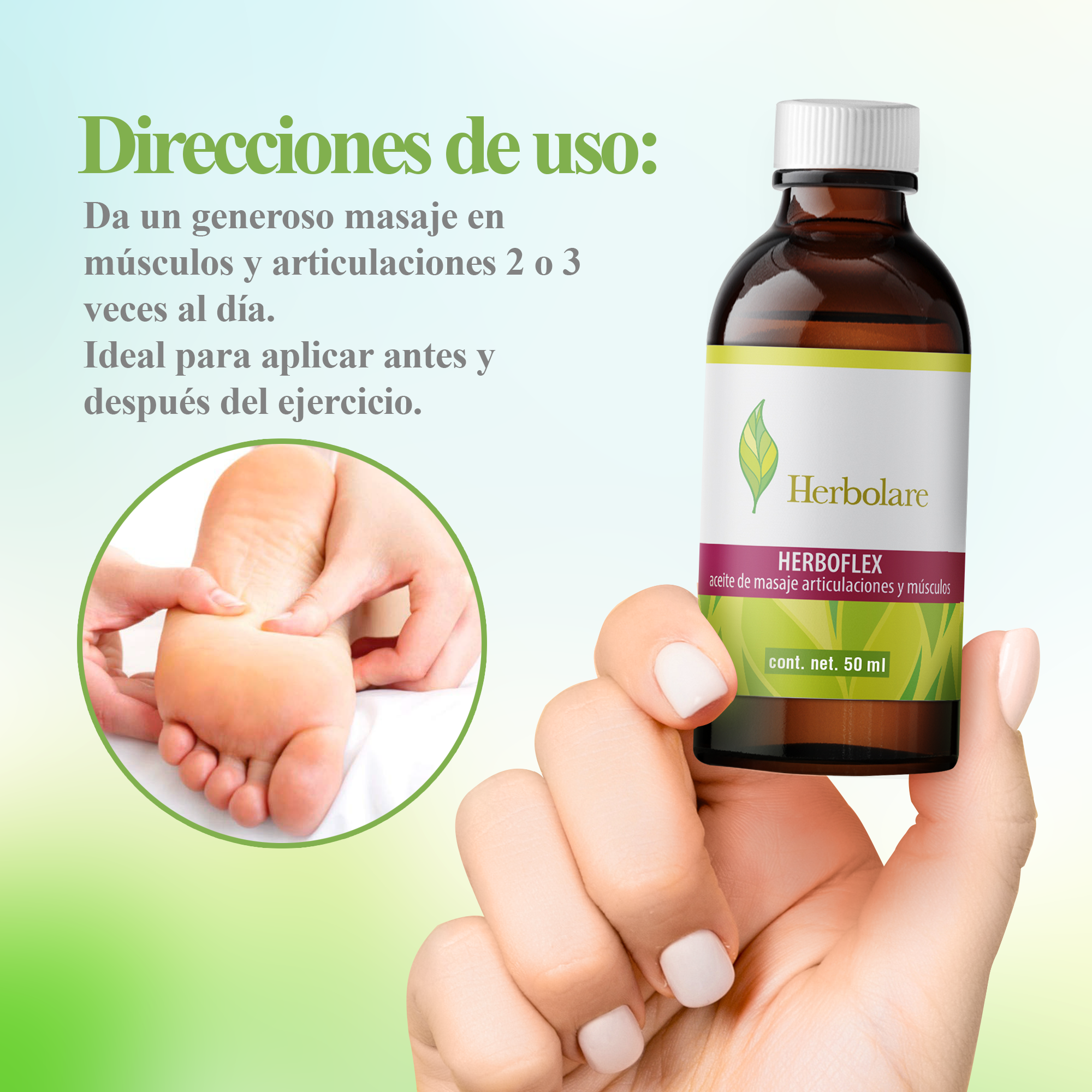 Herboflex de Herbolare es un aceite de masaje terapéutico 100% natural, formulado para brindar alivio profundo a músculos tensos, articulaciones rígidas y cuerpos fatigados después de actividad física. Gracias a su poderosa combinación de aceites esenciales puros y extractos vegetales, este aceite ayuda a recuperar la movilidad, reducir molestias y mantener la flexibilidad muscular y articular.
